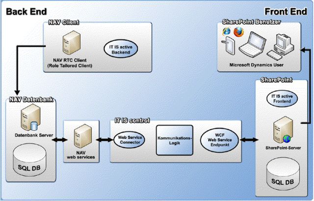 Wie auch schon sein Vorgänger, unterstützt IT IS active 2016 die Kommunikation zwischen Backend und Frontend über Webservices. Die Kommunikation ist in drei Stufen unterteilt. Die Daten aus dem NAV Backend werden per Web service an IT IS control gesendet. Die in IT IS control enthaltene Kommunikations-Logik gibt die Daten dann über einen weiteren Webservice an das SharePoint Frontend weiter. Zuletzt werden die Daten dann dem User über das Frontend dargestellt.